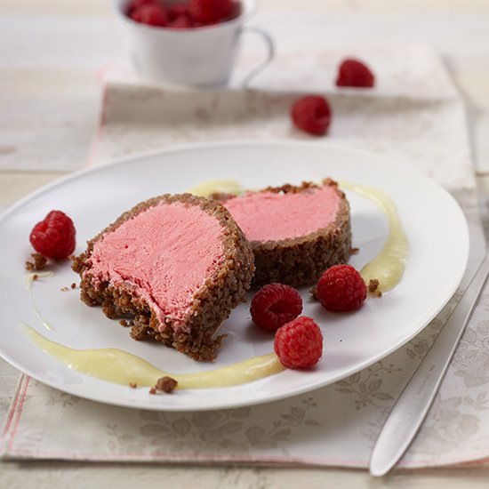 Anschließend erst das Himbeerpüree unterrühren und die Sahne mit einem Löffel unterheben. Die Masse in die vorbereitete Form füllen und mit den restlichen Bröseln abdecken. Mit Folie abdecken und mindestens 2 Stunden im Gefrierfach frosten, dann in Scheiben schneiden.