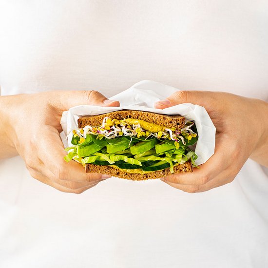 Pro Stulle je 2 Scheiben "HARRY Vital + Fit" mit Pesto-Hummus bestreichen. Eine Scheibe mit Avocado, Spinat, Salat, Gurke und Sprossen gleichmäßig belegen und mit der zweiten Scheibe abschließend zuklappen. Damit beim Transport nichts herausfällt, um die Stulle einen Streifen Butterbrotpapier wickeln.