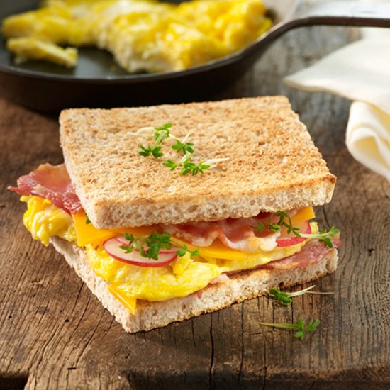 Die Sandwich Scheiben toasten und anschließend mit Rührei und Bacon belegen. Mit Kresse und Radieschen anrichten und eine zweite Scheiben oben drauf legen.