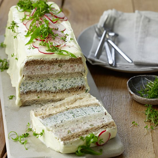 Eine Kastenform mit einem Gefrierbeutel auslegen. Sandwichbrote von der Rinde befreien: eine Lage von vier Scheiben Sandwichbrot unten in die Kastenform legen, dann mit den Belägen und drei weiteren Schichten Sandwichbrot alles schichten. Anschließend mit Klarsichtfolie abdecken und über Nacht mit einem Gewicht beschweren und im Kühlschrank durchziehen lassen.