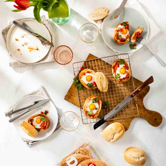 Um das Gericht noch würziger zu machen, könnt ihr die Shakshuka Brötchen auch noch mit Feta überbacken.