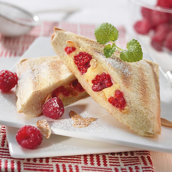 Etwas vom Vanillepudding mittig auf zwei Sandwichscheiben verteilen, mit Himbeeren belegen und mit Mandeln bestreuen.