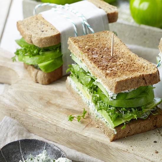 Sandwichbrot toasten, mit Frischkäse bestreichen und mit Avocado, Tomate, Gurke sowie Kresse zu vier Sandwiches belegen.